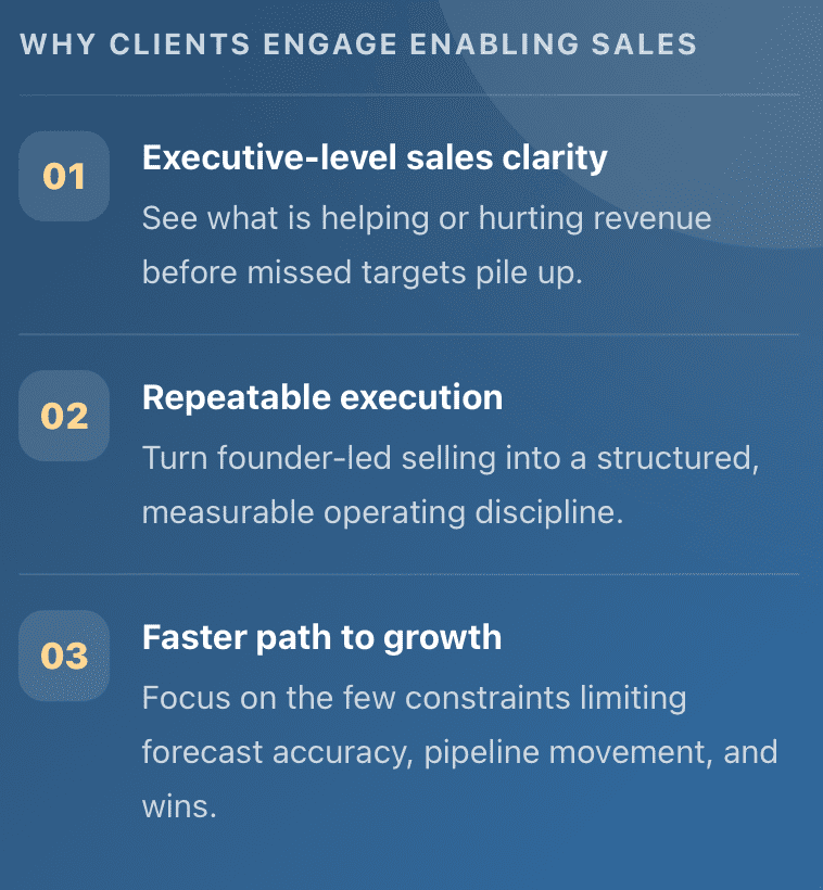 These client stories reinforce Enabling Sales LLC’s focus on practical execution, stronger visibility, and measurable business outcomes.